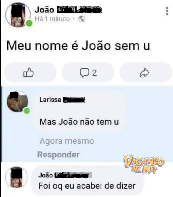 O soldado João sem u deve ter um certo trauma com algumas experiências negativas com seu nome e para evitar problemas no presente, só quis deixar claro que seu nome é João sem u. Boa sorte, jovem soldado!